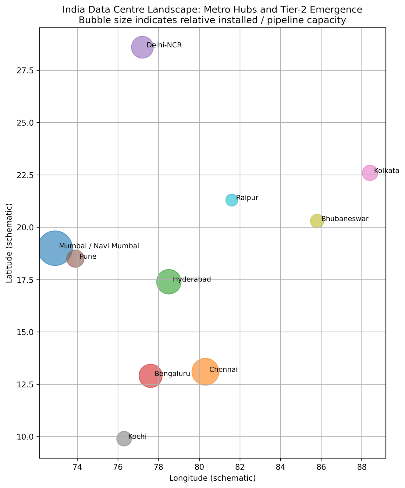 Emerging Tier-2 Hubs: Pune, Jaipur, Kochi, Bhubaneswar, Noida, Greater Noida, and Raipur are attracting investment. RackBank's 80 MW AI-focused facility in Raipur exemplifies this trend, leveraging central India location, renewable energy access, and state incentives.